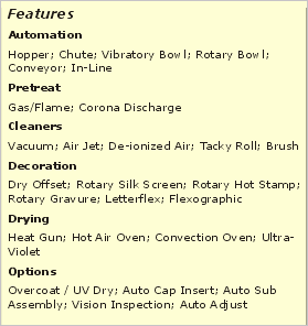 Following the loading section is an optional Gas Flame or Corona pre-treatment section where the part is rotated and the circumference is pre-treated prior to its entrance into the print station. Following the pre-treatment is the print section, where colors and graphics are added to the part. Next, the part indexes into a UV curing section where the part is rotated and the circumference is exposed to the UV light source until the ink is "cured" and dry. Finally, the part indexes so that it can be ejected.